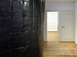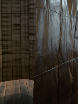 plane #2. 2018. Kohlepapier, Garn / carbon paper, yarn. 240×600 cm.