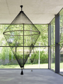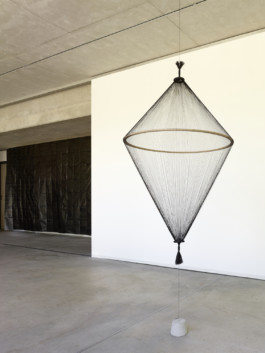 reifen#1, #2. 2017/2018. Holzreifen, Garn, Betonsockel / wooden hoop, yarn, concrete base. 140Ă—60Ă—60 cm,140Ă—80Ă—80 cm.